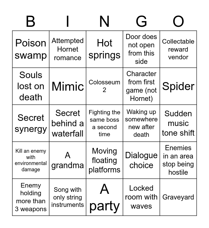 This bingo card has 58 words: NPC becomes a boss, Song with only string instruments, Character says a catchphrase, Kill an enemy with environmental damage, Locked room with waves, Double mini-boss, Mimic, Enemy causes screen shake, Character from first game (not Hornet), Pogo puzzle, Door does not open from this side, Needle art, Tragic NPC story line, Fake out boss, Attackable immune friendly NPC, Poison swamp, Fighting the same boss a second time, Collectable reward vendor, Deepnest 2, Colosseum 2, Waking up somewhere new after death, Hot springs, Enemy holding more than 3 weapons, Enemies in an area stop being hostile, Ally fights along side you, Sudden music tone shift, Fast travel system, Character forced to move slow, Spider, White Palace 2, Fake out boss/NPC death, Spotted a vessel, Area changes after story progress, Dream sequence, Falling through destroyed ground, Zipline, Hornet controls a "mech", Secret behind a waterfall, Secret synergy, Parrying, A grandma, Graveyard, Dialogue choice, Orange and purple on screen simultaneously, Breaking the 4th wall, Content creator reference, Videogame Easter egg, Moving floating platforms, A party, A bank, Insane character, Hornet not centered on screen (non-fight), Character customization, Lifeblood, Attempted Hornet romance, Steel Soul 2, Souls lost on death and Dies to a boss 5 times.