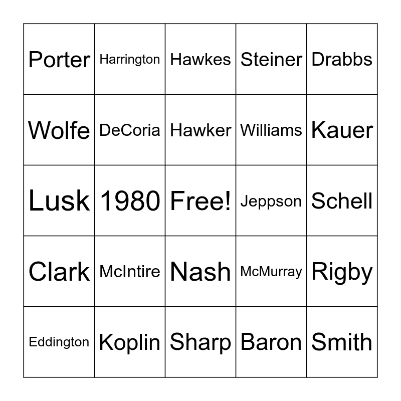 This bingo card has a free space and 34 words: Anderson, Baron, Bodell, Brough, Clark, DeCoria, Drabbs, Eddington, Harrington, Harrison, Hawker, Hawkes, Hopkin, Hunt, Jeppson, Kauer, Koplin, Lusk, McIntire, McMurray, Nash, Nelson, Porter, Schell, Sharp, Smith, Steiner, Taylor, Williams, Wolfe, Wright, 1980, Rigby and Trojans.