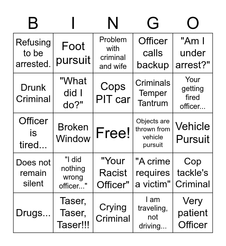 This bingo card has a free space and 29 words: Drugs..., Suspect has a gun, Broken Window, Guy with no shirt..., Refusing to be arrested., Problem with criminal and wife, "What did I do?", "I did nothing wrong officer...", Objects are thrown from vehicle pursuit, Taser, Taser, Taser!!!, Vehicle Pursuit, Very patient Officer, Crying Criminal, I am traveling, not driving..., Your getting fired officer..., Criminal gives officer consent..., "Your Racist Officer", Does not remain silent, "Am I under arrest?", Officer is tired..., "A crime requires a victim", Suspended or No drivers License, Criminals Temper Tantrum, Drunk Criminal, Officer calls backup, Foot pursuit, Cop tackle's Criminal, Cops PIT car and Criminal does not give up.