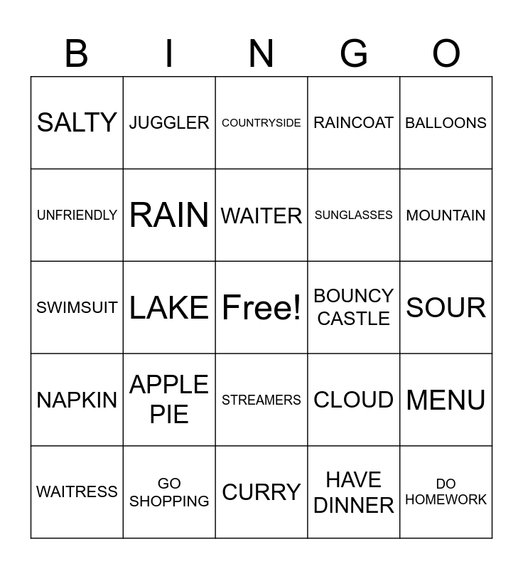 This bingo card has a free space and 25 words: APPLE PIE, CURRY, WAITER, WAITRESS, BALLOONS, SALTY, UNFRIENDLY, JUGGLER, BOUNCY CASTLE, STREAMERS, SUNGLASSES, SWIMSUIT, CLOUD, MENU, RAIN, SANDALS, SOUR, COUNTRYSIDE, MOUNTAIN, LAKE, DO HOMEWORK, GO SHOPPING, NAPKIN, RAINCOAT and HAVE DINNER.