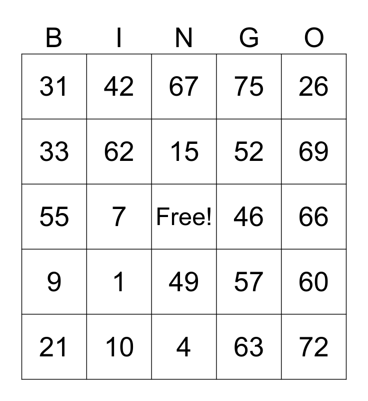 This bingo card has a free space and 24 words: 1, 10, 15, 21, 26, 31, 33, 42, 46, 49, 52, 55, 57, 60, 62, 63, 66, 67, 69, 7, 72, 9, 75 and 4.