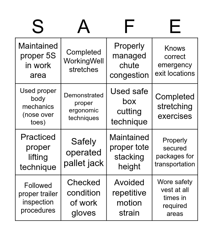 This bingo card has 25 words: Free!, Proper PPE worn, Completed stretching exercises, Identified and reported a hazard via Dragonfly, Used proper body mechanics (nose over toes), Maintained proper 5S in work area, Demonstrated proper ergonomic techniques, Completed WorkingWell stretches, Checked condition of work gloves, Stayed hydrated during shift, Practiced proper lifting technique, Maintained proper tote stacking height, Followed safe pod interaction procedures, Maintained safe rebin technique, Used safe box cutting technique, Maintained proper dunnage handling, Avoided repetitive motion strain, Properly managed chute congestion, Safely operated pallet jack, Properly secured packages for transportation, Followed proper trailer inspection procedures, Maintained 10 mph speed limit in the parking lot, Wore safety vest at all times in required areas, Knows correct emergency exit locations and Followed one piece flow.