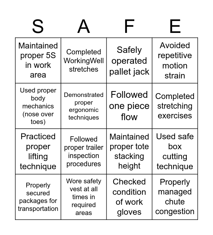 This bingo card has 26 words: Free!, Proper PPE worn, Completed stretching exercises, Identified and reported a hazard via Dragonfly, Used proper body mechanics (nose over toes), Maintained proper 5S in work area, Demonstrated proper ergonomic techniques, Completed WorkingWell stretches, Checked condition of work gloves, Stayed hydrated during shift, Practiced proper lifting technique, Maintained proper tote stacking height, Followed safe pod interaction procedures, Maintained safe rebin technique, Used safe box cutting technique, Maintained proper dunnage handling, Avoided repetitive motion strain, Properly managed chute congestion, Safely operated pallet jack, Properly secured packages for transportation, Followed proper trailer inspection procedures, Maintained 10 mph speed limit in the parking lot, Wore safety vest at all times in required areas, Knows correct emergency exit locations, Followed one piece flow and FREE.