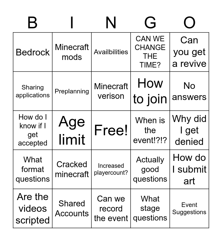This bingo card has a free space and 24 words: Cracked minecraft, Shared Accounts, Minecraft verison, Are the videos scripted, Can you get a revive, Bedrock, Sharing applications, Minecraft mods, When is the event!?!?, Increased playercount?, How to join, How do I know if I get accepted, Actually good questions, How do I submit art, Preplanning, What stage questions, Why did I get denied, Availbilities, No answers, Age limit, Event Suggestions, What format questions, CAN WE CHANGE THE TIME? and Can we record the event.