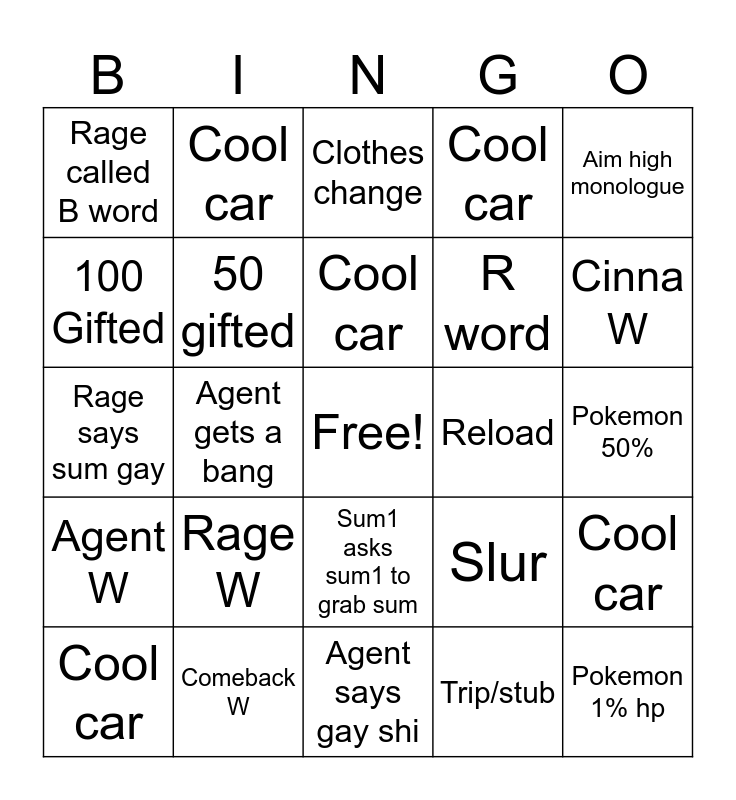 This bingo card has a free space and 29 words: Cool car, Rage gets tea or sum, Agent gets a bang, Food, Rage called B word, Clothes change, 50 gifted, Rage W, Reload, Comeback W, Pokemon 50%, Pokemon 1% hp, Agent says gay shi, Trip/stub, Cinna W, Animal on screen, Sum1 asks sum1 to grab sum, Agent W, Aim high monologue, Rage says sum gay, Slur, Technical issue, R word, 100 Gifted, Cool car, Cool car, Cool car, Cool car and Cool car.