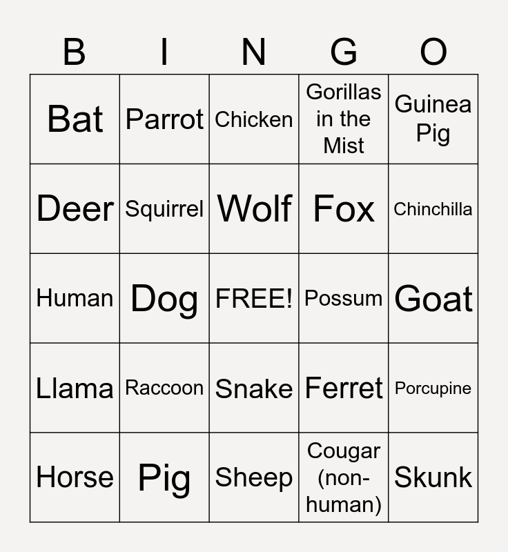 This bingo card has a free space and 29 words: Horse, Cat, Dog, Lemur, Bat, Chicken, Squirrel, Raccoon, Possum, Pig, Goat, Skunk, Sheep, Cougar (non-human), Chinchilla, Rat, Snake, Llama, Guinea Pig, Human, Ferret, Monkey, Fox, Deer, Gorillas in the Mist, Parrot, Porcupine, Wolf and Black Bear.