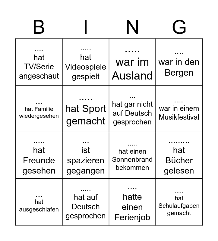 This bingo card has 20 words: ......... hat Bücher gelesen, ..... war am Strand, ..... war im Ausland, ..... hat Eis gegessen, .... hat ausgeschlafen, .... hat Familie wiedergesehen, ..... hat auf Deutsch gesprochen, .... hat TV/Serie angeschaut, ..... hat Freunde gesehen, ..... hat Videospiele gespielt, ... ist spazieren gegangen, ..... hat einen Sonnenbrand bekommen, ..... hat Sport gemacht, ..... hat Schulaufgaben gemacht, ... hat gar nicht auf Deutsch gesprochen, .... hat Zeit mit einer deutschen Freundin verbracht, ..... war in einem Musikfestival, .... war in den Bergen, .... hatte einen Ferienjob and .... hat Fotos/Videos auf Instagram/TikTok gepostet.