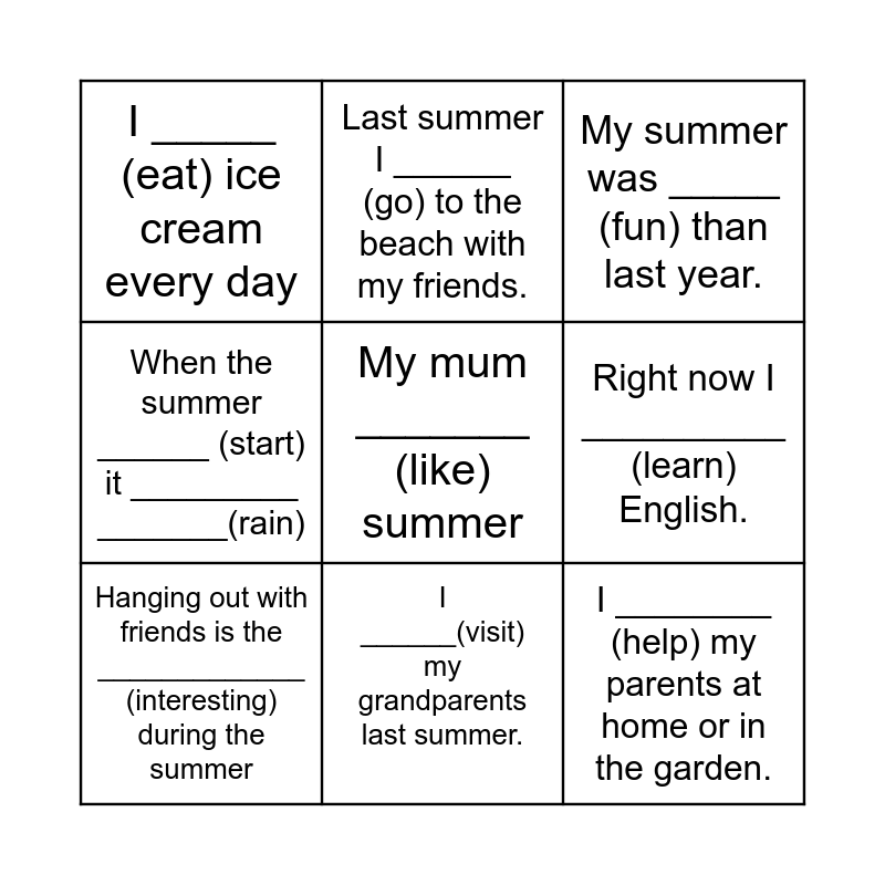 This bingo card has 12 words: I ____ (play) football every day last summer., I ________ (help) my parents at home or in the garden., My mum _______ (like) summer, Right now I __________ (learn) English., Last summer I ______ (go) to the beach with my friends., My summer was _____ (fun) than last year., I ______(visit) my grandparents last summer., I _______ (can) swim in the river very well., I _____ (eat) ice cream every day, When the summer ______ (start) it _________ _______(rain), Hanging out with friends is the _____________ (interesting) during the summer and I went on holiday on/by/in plane.
