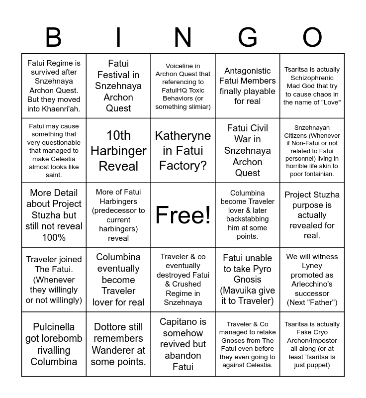 This bingo card has a free space and 24 words: Columbina eventually become Traveler lover for real, Dottore still remembers Wanderer at some points., Katheryne in Fatui Factory?, Pulcinella got lorebomb rivalling Columbina, Tsaritsa is actually Schizophrenic Mad God that try to cause chaos in the name of "Love", Fatui Regime is survived after Snzehnaya Archon Quest. But they moved into Khaenri'ah., Fatui may cause something that very questionable that managed to make Celestia almost looks like saint., Fatui Festival in Snzehnaya Archon Quest, Columbina become Traveler lover & later backstabbing him at some points., Traveler & co eventually destroyed Fatui & Crushed Regime in Snzehnaya, Fatui Civil War in Snzehnaya Archon Quest, More Detail about Project Stuzha but still not reveal 100%, Fatui unable to take Pyro Gnosis (Mavuika give it to Traveler), We will witness Lyney promoted as Arlecchino's successor (Next "Father"), 10th Harbinger Reveal, Traveler & Co managed to retake Gnoses from The Fatui even before they even going to against Celestia., Project Stuzha purpose is actually revealed for real., Voiceline in Archon Quest that referencing to FatuiHQ Toxic Behaviors (or something slimiar), Snzehnayan Citizens (Whenever if Non-Fatui or not related to Fatui personnel) living in horrible life akin to poor fontainian., More of Fatui Harbingers (predecessor to current harbingers) reveal, Tsaritsa is actually Fake Cryo Archon/Impostor all along (or at least Tsaritsa is just puppet), Traveler joined The Fatui. (Whenever they willingly or not willingly), Antagonistic Fatui Members finally playable for real and Capitano is somehow revived but abandon Fatui.