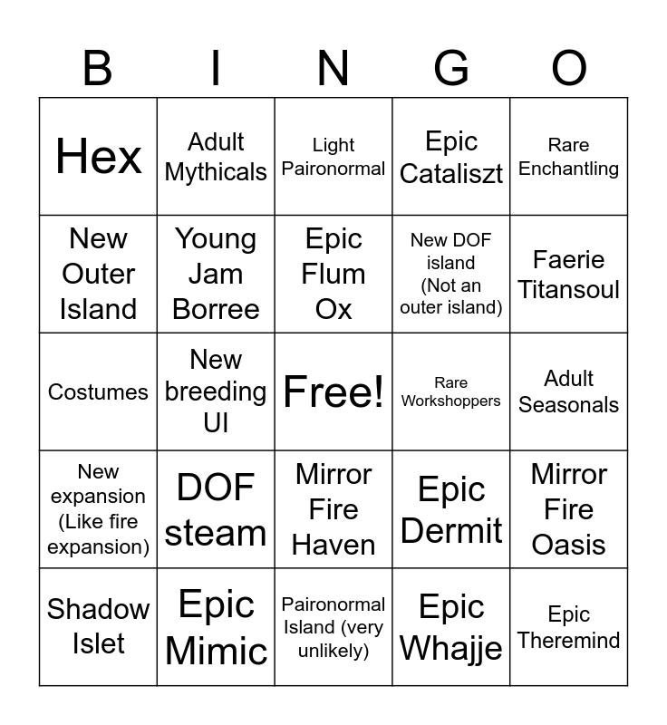 This bingo card has a free space and 24 words: DOF steam, Epic Mimic, Epic Flum Ox, Shadow Islet, Rare Enchantling, Hex, New Outer Island, Adult Mythicals, Rare Workshoppers, Mirror Fire Haven, New DOF island (Not an outer island), Costumes, Epic Dermit, Mirror Fire Oasis, Young Jam Borree, Epic Whajje, Adult Seasonals, Light Paironormal, Faerie Titansoul, New breeding UI, Epic Theremind, New expansion (Like fire expansion), Epic Cataliszt and Paironormal Island (very unlikely).