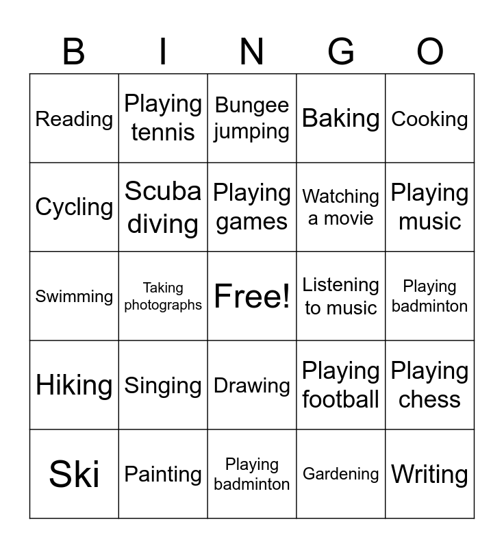 This bingo card has a free space and 24 words: Singing, Painting, Playing games, Ski, Cooking, Reading, Cycling, Playing tennis, Listening to music, Drawing, Watching a movie, Swimming, Playing football, Playing chess, Scuba diving, Gardening, Playing badminton, Bungee jumping, Playing music, Taking photographs, Writing, Hiking, Baking and Playing badminton.