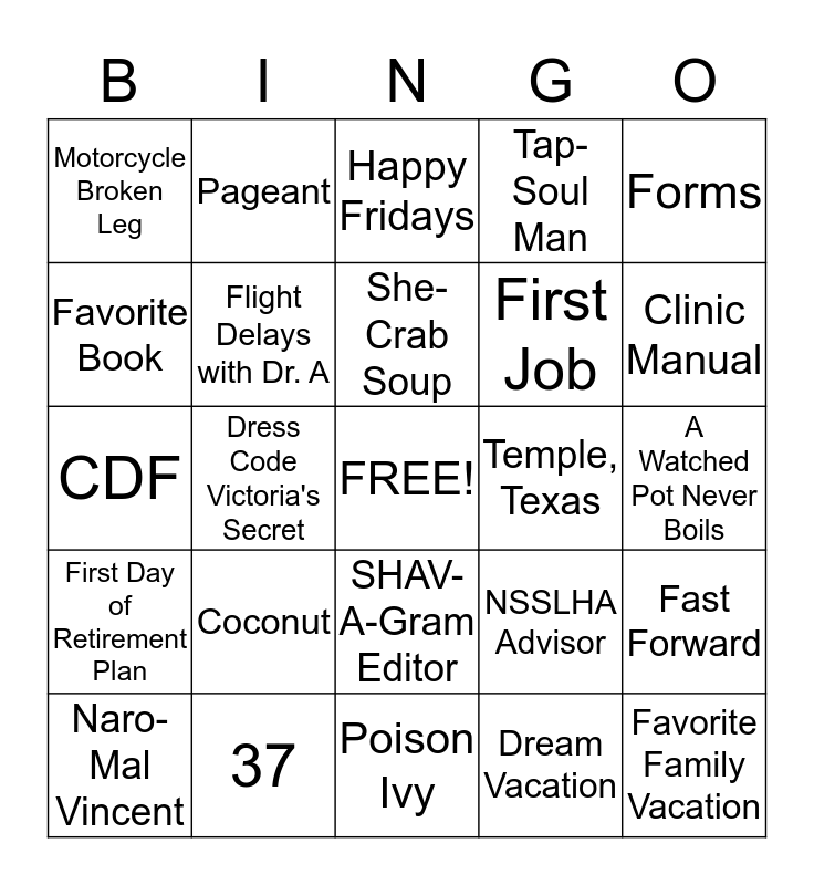 This bingo card has a free space and 24 words: Coconut, 37, She-Crab Soup, Naro-Mal Vincent, Forms, Motorcycle Broken Leg, Favorite Book, Pageant, Temple, Texas, SHAV-A-Gram Editor, First Job, CDF, NSSLHA Advisor, Fast Forward, Flight Delays with Dr. A, Dream Vacation, A Watched Pot Never Boils, Happy Fridays, Clinic Manual, Dress Code Victoria's Secret, Favorite Family Vacation, First Day of Retirement Plan, Tap-Soul Man and Poison Ivy.