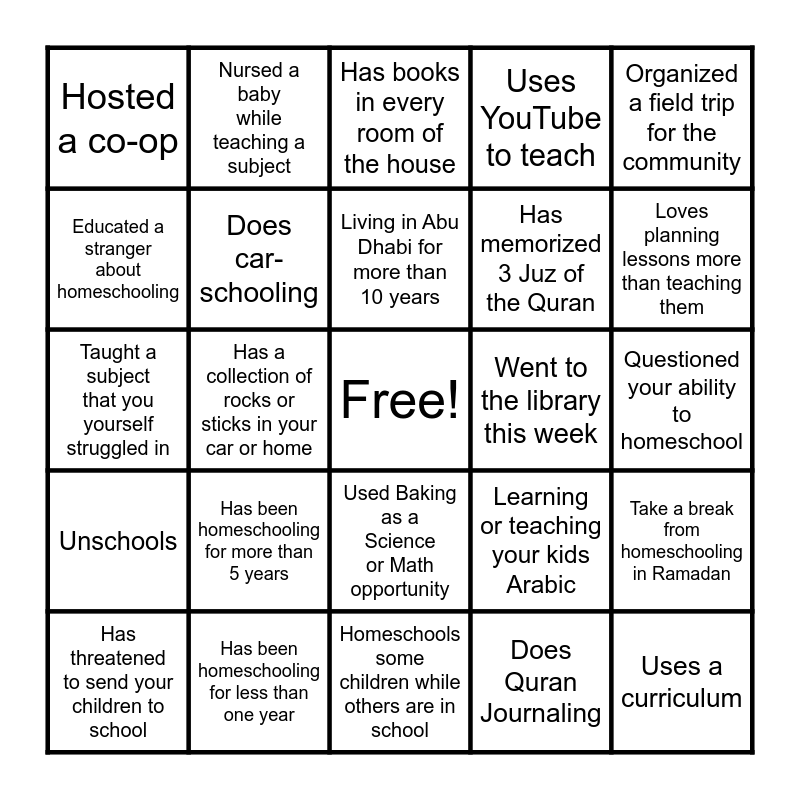 This bingo card has a free space and 24 words: Has been homeschooling for more than 5 years, Has been homeschooling for less than one year, Living in Abu Dhabi for more than 10 years, Has threatened to send your children to school, Organized a field trip for the community, Hosted a co-op, Educated a stranger about homeschooling, Nursed a baby while teaching a subject, Went to the library this week, Used Baking as a Science or Math opportunity, Has memorized 3 Juz of the Quran, Taught a subject that you yourself struggled in, Learning or teaching your kids Arabic, Take a break from homeschooling in Ramadan, Does car-schooling, Does Quran Journaling, Questioned your ability to homeschool, Has books in every room of the house, Loves planning lessons more than teaching them, Has a collection of rocks or sticks in your car or home, Uses a curriculum, Unschools, Uses YouTube to teach and Homeschools some children while others are in school.
