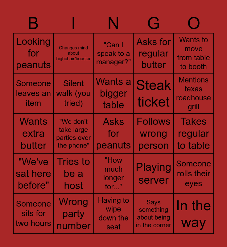 This bingo card has a free space and 24 words: Tries to be a host, Wrong party number, Wants a bigger table, Someone sits for two hours, Wants to move from table to booth, Looking for peanuts, Someone leaves an item, Changes mind about highchair/booster, Follows wrong person, "How much longer for...", Steak ticket, Wants extra butter, Playing server, Someone rolls their eyes, Silent walk (you tried), Says something about being in the corner, Takes regular to table, "Can I speak to a manager?", Mentions texas roadhouse grill, "We don't take large parties over the phone", In the way, "We've sat here before", Asks for regular butter and Having to wipe down the seat.