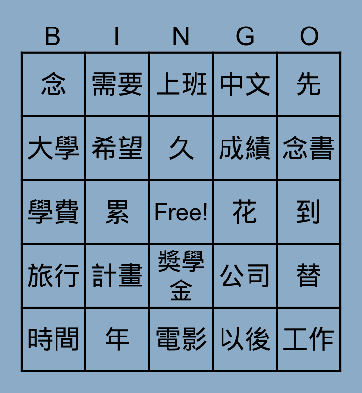 This bingo card has a free space and 24 words: 計畫, 年, 久, 時間, 先, 念, 大學, 需要, 花, 獎學金, 成績, 學費, 公司, 替, 希望, 以後, 到, 上班, 念書, 累, 工作, 旅行, 中文 and 電影.