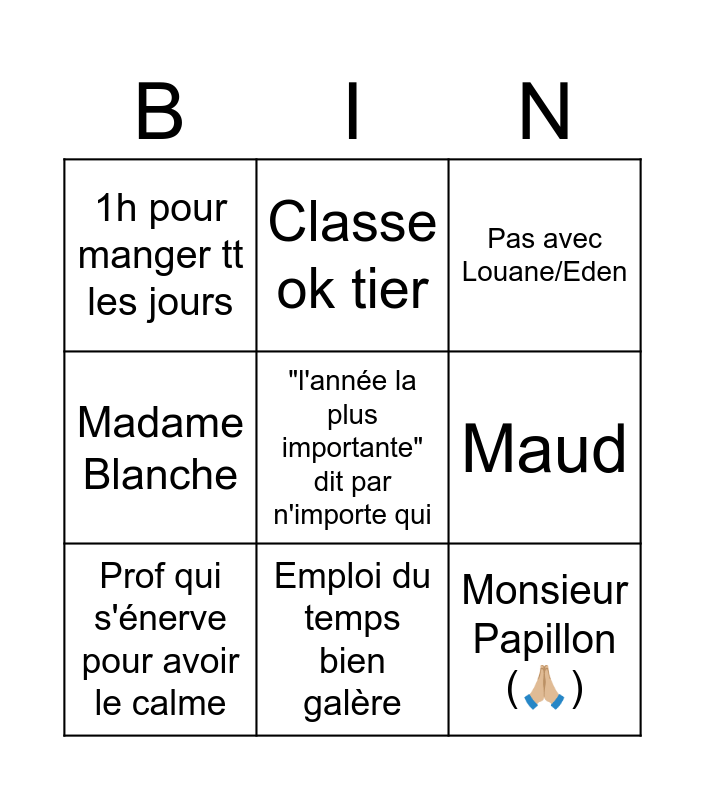 This bingo card has a free space and 8 words: Maud, Pas avec Louane/Eden, Classe ok tier, Prof qui s'énerve pour avoir le calme, 1h pour manger tt les jours, Monsieur Papillon (🙏🏼), Madame Blanche and Emploi du temps bien galère.