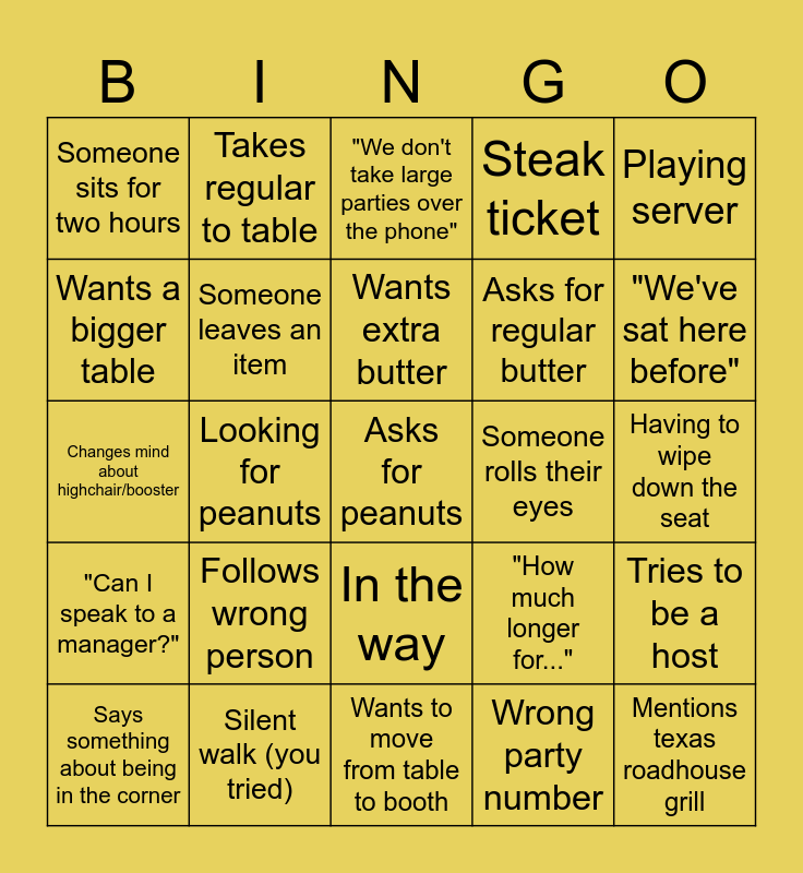 This bingo card has a free space and 24 words: Follows wrong person, Silent walk (you tried), Wants extra butter, Says something about being in the corner, Playing server, Someone sits for two hours, Wants a bigger table, Takes regular to table, Someone rolls their eyes, In the way, Asks for regular butter, Changes mind about highchair/booster, "How much longer for...", Tries to be a host, Someone leaves an item, Wrong party number, Having to wipe down the seat, "We don't take large parties over the phone", "We've sat here before", Looking for peanuts, Mentions texas roadhouse grill, "Can I speak to a manager?", Steak ticket and Wants to move from table to booth.