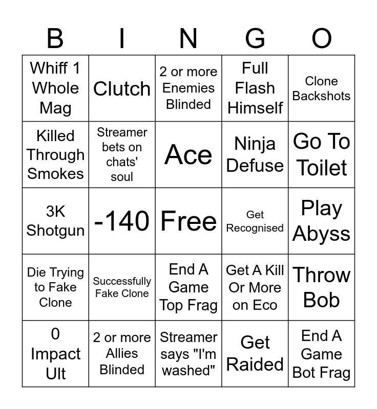This bingo card has a free space and 24 words: Successfully Fake Clone, 2 or more Allies Blinded, Ace, 0 Impact Ult, Clone Backshots, Whiff 1 Whole Mag, Killed Through Smokes, Clutch, Get Recognised, End A Game Top Frag, Ninja Defuse, 3K Shotgun, Get A Kill Or More on Eco, Throw Bob, Streamer bets on chats' soul, Get Raided, Play Abyss, 2 or more Enemies Blinded, Go To Toilet, -140, End A Game Bot Frag, Die Trying to Fake Clone, Full Flash Himself and Streamer says "I'm washed".