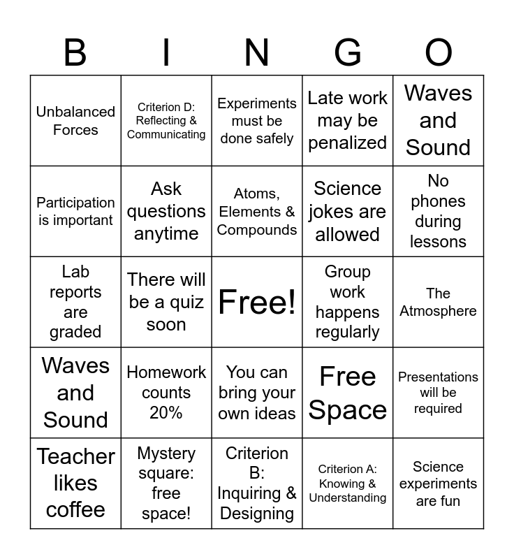 This bingo card has a free space and 25 words: Homework counts 20%, Criterion B: Inquiring & Designing, Atoms, Elements & Compounds, Teacher likes coffee, Waves and Sound, Unbalanced Forces, Participation is important, Criterion D: Reflecting & Communicating, Group work happens regularly, You can bring your own ideas, Science jokes are allowed, Lab reports are graded, Free Space, Presentations will be required, Ask questions anytime, Criterion C: Processing & Evaluating, The Atmosphere, Experiments must be done safely, No phones during lessons, There will be a quiz soon, Science experiments are fun, Mystery square: free space!, Waves and Sound, Late work may be penalized and Criterion A: Knowing & Understanding.