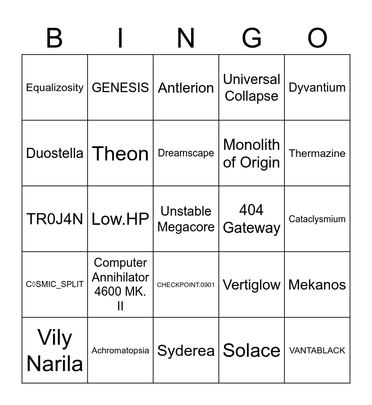 This bingo card has a free space and 24 words: Computer Annihilator 4600 MK. II, Achromatopsia, Dreamscape, Vily Narila, Dyvantium, Equalizosity, Duostella, GENESIS, 404 Gateway, CHECKPOINT.0901, Monolith of Origin, TR0J4N, Vertiglow, Mekanos, Theon, Solace, Cataclysmium, Antlerion, Thermazine, Low.HP, VANTABLACK, C◊SMIC_SPLIT, Universal Collapse and Syderea.