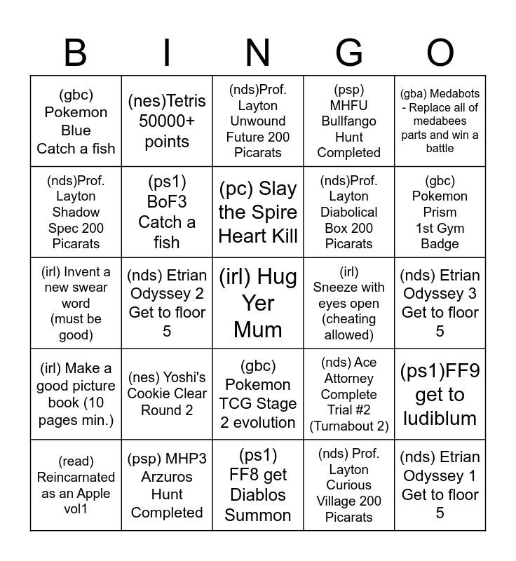 This bingo card has a free space and 28 words: (ps1)FF9 get to ludiblum, (ps1) Chrono Cross complete viper manor, (nds)Prof. Layton Diabolical Box 200 Picarats, (nds) Prof. Layton Curious Village 200 Picarats, (nds)Prof. Layton Shadow Spec 200 Picarats, (nds)Prof. Layton Unwound Future 200 Picarats, (nes)Tetris 50000+ points, (irl) Make a good picture book (10 pages min.), (irl) Sneeze with eyes open (cheating allowed), (read) Reincarnated as an Apple vol1, (irl) Invent a new swear word (must be good), (psp) MHFU Bullfango Hunt Completed, (psp) MHP3 Arzuros Hunt Completed, (ps1) FF8 get Diablos Summon, (gbc) Pokemon Prism 1st Gym Badge, (nes) Super Mario Bros 3 Clear world 1 fortress (mini castle), (nes) Yoshi's Cookie Clear Round 2, (ps1) BoF3 Catch a fish, (pc) Slay the Spire Heart Kill, (gbc) Pokemon TCG Stage 2 evolution, (gbc) Pokemon Blue Catch a fish, (ps1) Gran Turismo Simulation mode Sunday Cup Win, (nds) Etrian Odyssey 1 Get to floor 5, (nds) Etrian Odyssey 2 Get to floor 5, (nds) Etrian Odyssey 3 Get to floor 5, (nds) Ace Attorney Complete Trial #2 (Turnabout 2), (gba) Medabots - Replace all of medabees parts and win a battle and (nes) Gunnac beat world 3, normal difficulty (dont change).