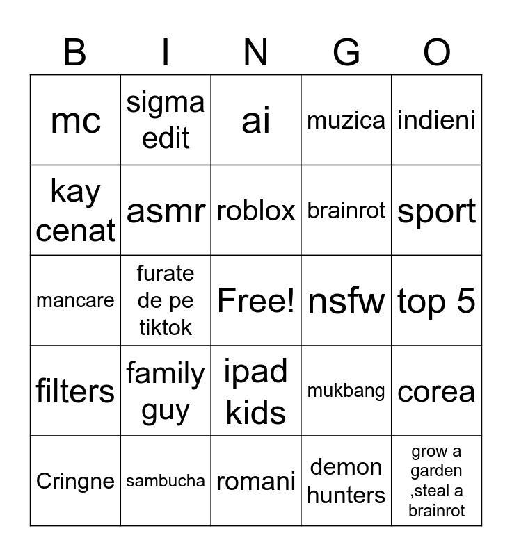 This bingo card has a free space and 24 words: Cringne, family guy, roblox, demon hunters, indieni, mc, sigma edit, ai, nsfw, top 5, mancare, asmr, mukbang, corea, kay cenat, sambucha, romani, muzica, sport, filters, furate de pe tiktok, ipad kids, brainrot and grow a garden ,steal a brainrot.