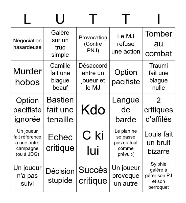 This bingo card has a free space and 24 words: Echec critique, Décision stupide, Désaccord entre un joueur et le MJ, Un joueur n'a pas suivi, Tomber au combat, Négociation hasardeuse, Murder hobos, Galère sur un truc simple, Langue de barde, C ki lui, Option pacifiste, Option pacifiste ignorée, Le plan ne se passe pas du tout comme prévu :(, Louis fait un bruit bizarre, Camille fait une blague beauf, Un joueur provoque un autre, 2 critiques d'affilés, Provocation (Contre PNJ), Traumi fait une blague nulle, Bastien fait une tenaille, Sylphie galère à gérer son PJ et son perroquet, Un joueur fait référence à une autre campagne (ou à JDG), Le MJ refuse une action and Succès critique.