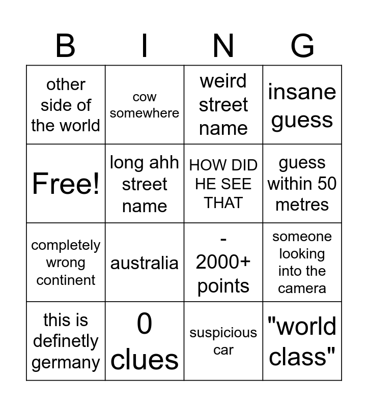 This bingo card has 16 words: 0 clues, someone looking into the camera, weird street name, other side of the world, completely wrong continent, cow somewhere, - 2000+ points, suspicious car, Free!, long ahh street name, this is definetly germany, insane guess, australia, guess within 50 metres, HOW DID HE SEE THAT and "world class".
