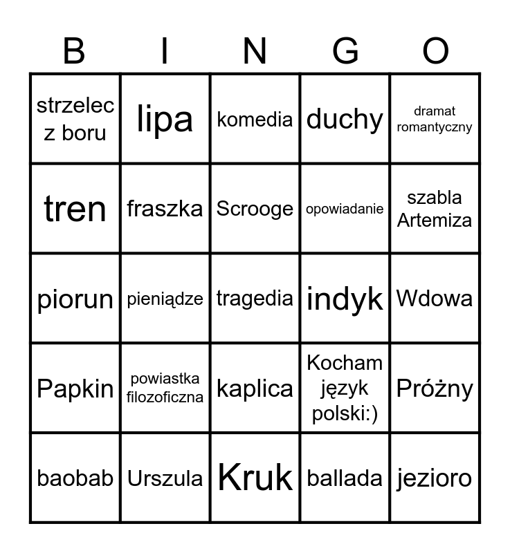 This bingo card has 25 words: powiastka filozoficzna, Kruk, Scrooge, baobab, dramat romantyczny, strzelec z boru, tren, lipa, indyk, kaplica, opowiadanie, piorun, Kocham język polski:), Próżny, fraszka, jezioro, Wdowa, komedia, szabla Artemiza, pieniądze, tragedia, Urszula, Papkin, duchy and ballada.