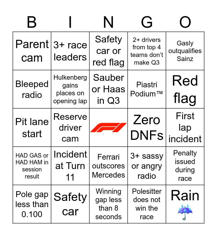 This bingo card has a free space and 27 words: 3+ sassy or angry radio, 10+ second pit stop, Piastri Podium™️, Winning gap less than 8 seconds, Bleeped radio, Safety car or red flag, 3+ race leaders, HAD GAS or HAD HAM in session result, Zero DNFs, Penalty issued during race, Pit lane start, 2+ drivers from top 4 teams don’t make Q3, Pole gap less than 0.100, Safety car, Red flag, Beached in gravel, Hulkenberg gains places on opening lap, Sauber or Haas in Q3, Incident at Turn 11, Parent cam, First lap incident, Polesitter does not win the race, Reserve driver cam, Rain ☔️, Ferrari outscores Mercedes, Gasly outqualifies Sainz and 7+ teams score points.