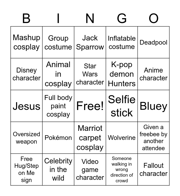 This bingo card has a free space and 35 words: Broken prop, Posing for picture blocking walkway, Full fursuit, Animal in cosplay, Marriot carpet cosplay, Inflatable costume, Disney character, Excessive ribbons (10+), Star Wars character, Cosplay medic, Jesus, Deadpool, Someone in same cosplay as you, Waldo, Mashup cosplay, Selfie stick, Someone walking in wrong direction of crowd, Full body paint cosplay, Oversized weapon, Fallout character, Wolverine, Free Hug/Step on Me sign, Given a freebee by another attendee, Celebrity in the wild, Jack Sparrow, Anime character, Dragon, Wicked, K-pop demon Hunters, Bluey, Arcane, Video game character, Pokémon, Group costume and Family costume.