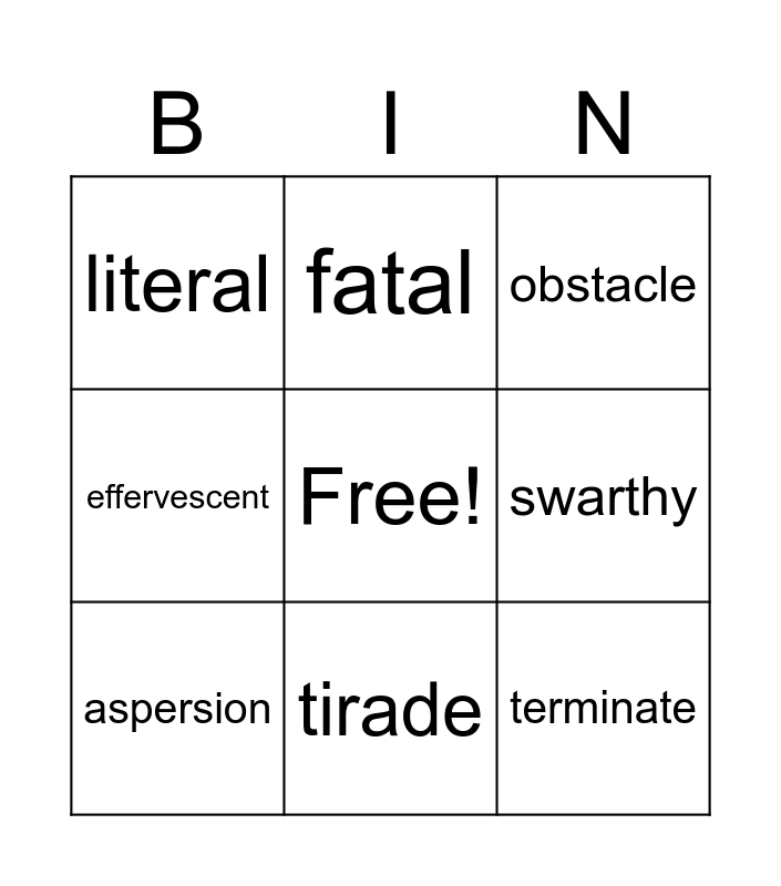 This bingo card has a free space and 8 words: swarthy, obstacle, fatal, aspersion, literal, terminate, effervescent and tirade.