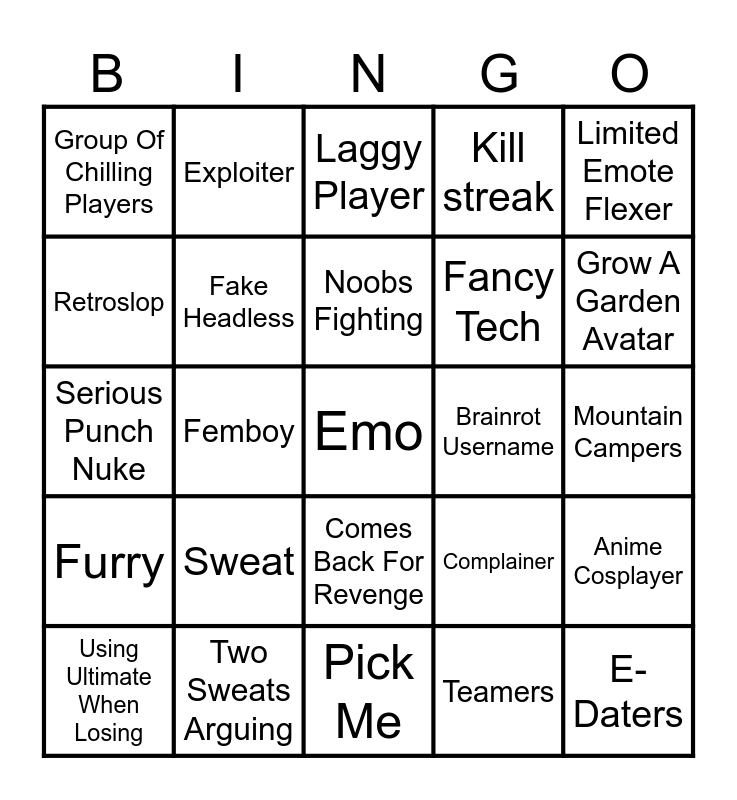 This bingo card has 25 words: Sweat, Pick Me, Noobs Fighting, Using Ultimate When Losing, Limited Emote Flexer, Group Of Chilling Players, Retroslop, Exploiter, Brainrot Username, Comes Back For Revenge, Fancy Tech, Serious Punch Nuke, Complainer, Anime Cosplayer, Fake Headless, E-Daters, Mountain Campers, Laggy Player, Grow A Garden Avatar, Femboy, Emo, Two Sweats Arguing, Furry, Kill streak and Teamers.