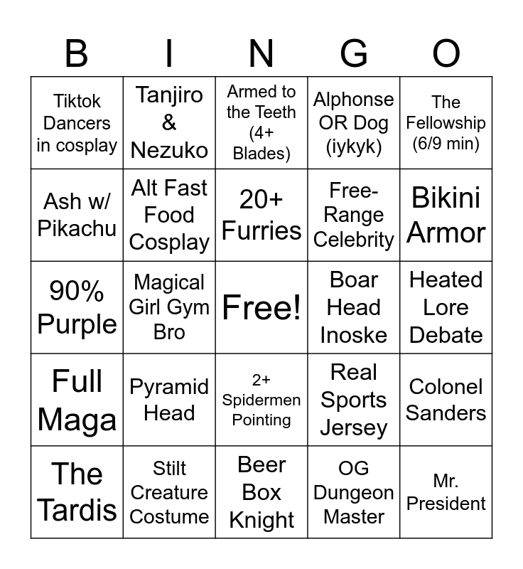 This bingo card has a free space and 24 words: Pyramid Head, Stilt Creature Costume, 20+ Furries, The Tardis, The Fellowship (6/9 min), Tiktok Dancers in cosplay, Ash w/ Pikachu, Tanjiro & Nezuko, Boar Head Inoske, 2+ Spidermen Pointing, Free-Range Celebrity, 90% Purple, Real Sports Jersey, Colonel Sanders, Alt Fast Food Cosplay, OG Dungeon Master, Heated Lore Debate, Armed to the Teeth (4+ Blades), Bikini Armor, Magical Girl Gym Bro, Mr. President, Full Maga, Alphonse OR Dog (iykyk) and Beer Box Knight.