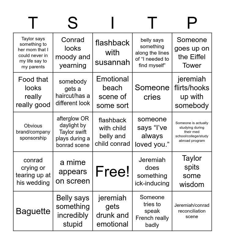 This bingo card has 26 words: Free!, Someone tries to speak French really badly, Emotional beach scene of some sort, Belly says something incredibly stupid, Someone goes up on the Eiffel Tower, Taylor says something to her mom that I could never in my life say to my parents, Food that looks really really good, Conrad looks moody and yearning, Someone is actually studying during their med school/college/study abroad program, Jeremiah does something ick-inducing, Someone cries, Obvious brand/company sponsorship, Taylor spits some wisdom, Baguette, afterglow OR daylight by Taylor swift plays during a bonrad scene, belly gets drunk and dances with her eyes closed for at least two seconds, belly says something along the lines of “I needed to find myself”, conrad crying or tearing up at his wedding, flashback with susannah, flashback with child belly and child conrad, jeremiah flirts/hooks up with somebody, jeremiah gets drunk and emotional, someone says “I’ve always loved you.”, a mime appears on screen, somebody gets a haircut/has a different look and Jeremiah/conrad reconciliation scene.