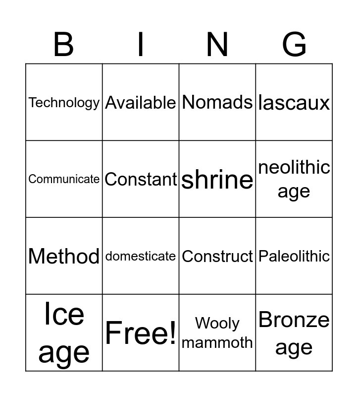 This bingo card has 16 words: Free!, Paleolithic, Nomads, Technology, Method, Available, Construct, Wooly mammoth, Communicate, Constant, Ice age, lascaux, domesticate, neolithic age, shrine and Bronze age.