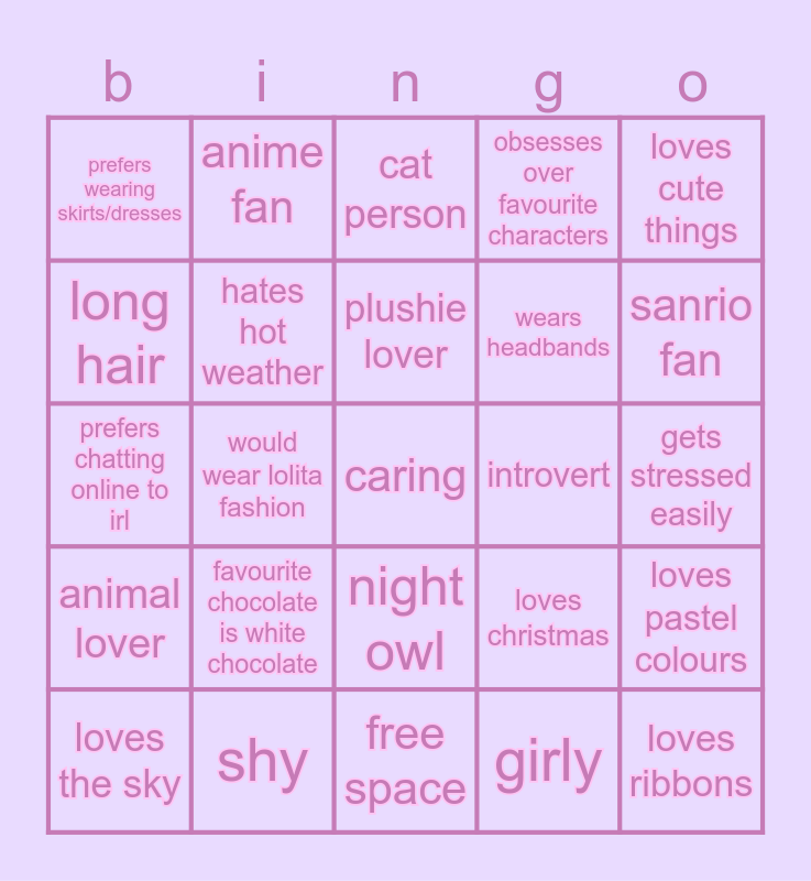 This bingo card has 25 words: animal lover, shy, caring, girly, loves cute things, prefers wearing skirts/dresses, anime fan, cat person, introvert, loves pastel colours, long hair, hates hot weather, free space, loves christmas, sanrio fan, loves the sky, would wear lolita fashion, plushie lover, wears headbands, gets stressed easily, prefers chatting online to irl, favourite chocolate is white chocolate, night owl, obsesses over favourite characters and loves ribbons.