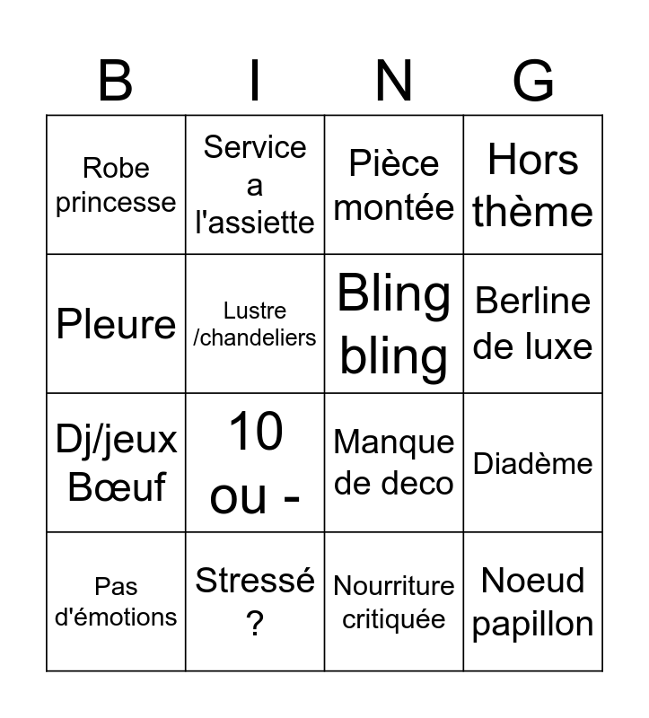 This bingo card has 16 words: Stressé ?, Diadème, Pièce montée, Robe princesse, Dj/jeux Bœuf, Service a l'assiette, Manque de deco, Nourriture critiquée, Pleure, Lustre /chandeliers, Pas d'émotions, Hors thème, 10 ou -, Berline de luxe, Bling bling and Noeud papillon.