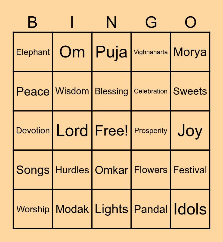 This bingo card has a free space and 29 words: Ganesh, Modak, Puja, Ganpati, Morya, Elephant, Wisdom, Blessing, Prosperity, Festival, Worship, Lord, Pandal, Idols, Devotion, Clay, Lights, Flowers, Sweets, Songs, Hurdles, New beginnings, Celebration, Joy, Peace, Om, Omkar, Vighnaharta and Auspicious.