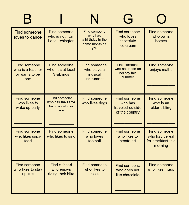 This bingo card has 30 words: Find a friend who enjoys riding their bike _____________, Find someone who is left handed _____________, Find someone who has the same favorite color as you _____________, Find someone who speaks more than 1 language _____________, Find someone loves to dance ___________, Find someone who has a birthday in the same month as you _____________, Find someone who has at least 3 siblings _____________, Find someone who loves football __________, Find someone who has traveled outside of the country _____________, Find someone who likes to bake _____________, Find someone who is an older sibling _____________, Find someone who likes dogs _____________, Find someone who does not like chocolate ____________, Find someone who likes music _____________, Find someone enjoys maths _____________, Find someone who will tell you the last book they read _____________, Find someone who likes to create art _____________, Find someone who likes spicy food _____________, Find someone who likes to sing _____________, Find someone who owns horses _____________, Find someone who likes to wake up early _____________, Find someone who is a Taylor Swift fan _____________, Find someone who is not from Long Itchington _____________, Find someone who has been on holiday this summer ____________, Find someone who is a teacher or wants to be one _____________, Find someone who loves chocolate ice cream _____________, Find someone who had cereal for breakfast this morning _____________, Find someone who likes to stay up late _____________, Find someone who plays a musical instrument _____________ and Find someone who moved schools last year _____________.