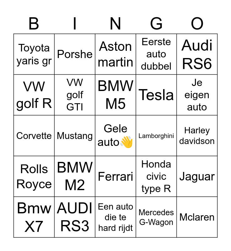 This bingo card has a free space and 24 words: BMW M2, AUDI RS3, BMW M5, Bmw X7, Audi RS6, Toyota yaris gr, VW golf R, Porshe, Lamborghini, Ferrari, Tesla, Corvette, Honda civic type R, Jaguar, VW golf GTI, Mercedes G-Wagon, Harley davidson, Aston martin, Je eigen auto, Mustang, Mclaren, Rolls Royce, Eerste auto dubbel and Een auto die te hard rijdt.