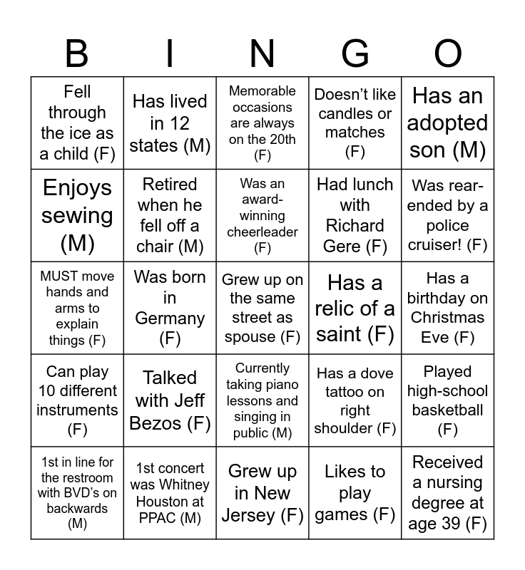 This bingo card has 54 words: Buys organic produce for yard bunnies (F), Can play 10 different instruments (F), Can whistle like a bird (F), Competed in Ladies Ballroom Dance (F), Currently taking piano lessons and singing in public (M), Did a 3-day bike ride in the Austrian Alps (F), Doesn’t like candles or matches (F), Dressed as an Indian for HS rally (F), Enjoys sewing (M), Favorite trip was to Paris (F), Fell through the ice as a child (F), 1st concert was Chicago / Beach Boys (F), 1st concert was Whitney Houston at PPAC (M), 1st in line for the restroom with BVD’s on backwards (M), Gave up a pilot’s license for a handsome man (F), Grew up in New Jersey (F), Grew up on the same street as spouse (F), Had lunch with Richard Gere (F), Has 2 dogs and a horse (F), Has a birthday on Christmas Eve (F), Has a dove tattoo on right shoulder (F), Has a motorcycle license (F), Has a relic of a saint (F), Has an adopted son (M), Has fifty years of sailing but can’t swim (F), Has lived in 12 states (M), Has lived in 7 states (F), Joined the Army at age 17 (M), Learned to drive at age 32 (F), Likes to play games (F), Likes to twirl her hair (F), Loves IPA (beer) (F), Made a nun faint in 7th grade (M), Made pie crust with homemade Play Dough (F), Memorable occasions are always on the 20th (F), Met spouse on a blind date (F), MUST move hands and arms to explain things (F), Played high-school basketball (F), Received a nursing degree at age 39 (F), Retired when he fell off a chair (M), Sailed to the Bahamas at age 23 (F), Sang in a choir for 12 years (F), Skipped work for a Grateful Dead concert (F), Swam from Newport to Jamestown (F), Talked with Jeff Bezos (F), Took 4 years of Russian (F), Took dancing lessons at age 18 (F), Walked around school building on the windowsills (M), Was an award-winning cheerleader (F), Was born in Germany (F), Was rear-ended by a police cruiser! (F), Was read Miranda Rights as a “Drug Queen” (F), Was the first baby born that year (F) and Won 1st place in a shooting contest (F).