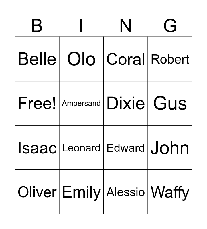 This bingo card has 16 words: Emily, John, Coral, Belle, Isaac, Olo, Edward, Alessio, Free!, Ampersand, Oliver, Robert, Leonard, Gus, Dixie and Waffy.