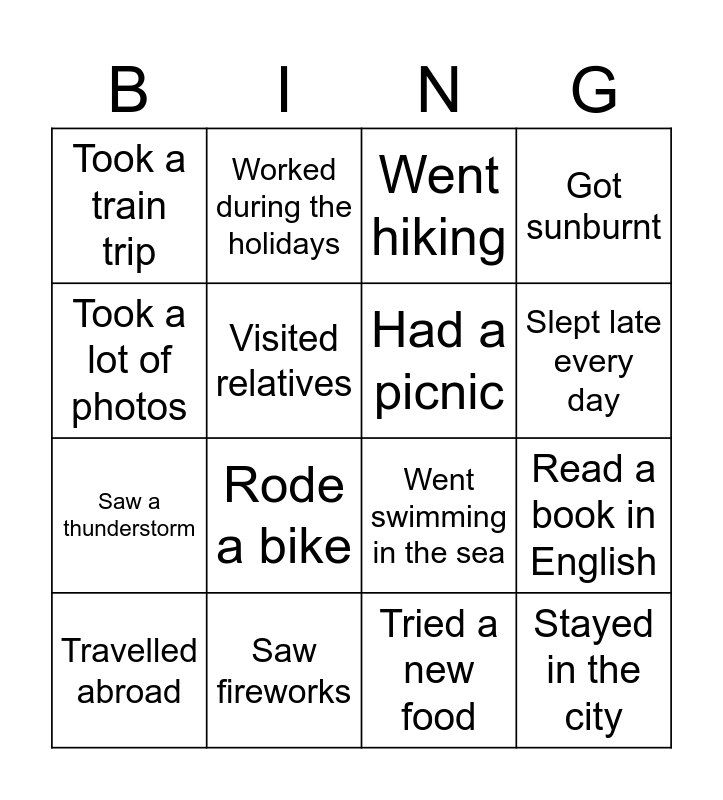 This bingo card has 16 words: Saw fireworks, Read a book in English, Went hiking, Took a train trip, Saw a thunderstorm, Worked during the holidays, Went swimming in the sea, Tried a new food, Took a lot of photos, Visited relatives, Travelled abroad, Got sunburnt, Rode a bike, Slept late every day, Had a picnic and Stayed in the city.