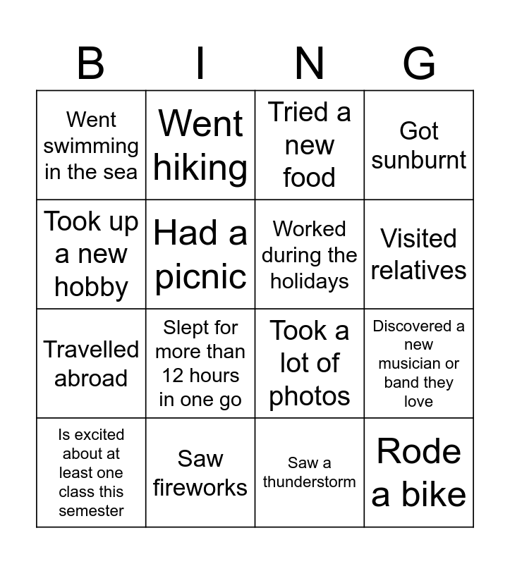 This bingo card has 21 words: Saw fireworks, Read a book in English, Went hiking, Took a train trip, Saw a thunderstorm, Worked during the holidays, Went swimming in the sea, Tried a new food, Took a lot of photos, Visited relatives, Travelled abroad, Got sunburnt, Rode a bike, Slept late every day, Had a picnic, Stayed in the city, Is excited about at least one class this semester, Slept for more than 12 hours in one go, Took up a new hobby, Discovered a new musician or band they love and Binge-watched an entire TV series.