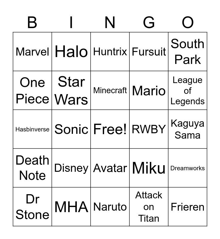 This bingo card has a free space and 29 words: Dr Stone, Zenless Zone Zero, Sonic, Zelda, Marvel, Huntrix, Star Wars, Disney, RWBY, MHA, Kaguya Sama, Frieren, Naruto, Attack on Titan, League of Legends, Pokemon, Avatar, Death Note, South Park, Hasbinverse, Miku, Aggretsuko, Mario, One Piece, Fursuit, Halo, Dreamworks, Minecraft and Sailor Moon.
