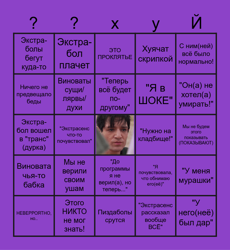 This bingo card has a free space and 24 words: Мы не верили своим ушам, Этого НИКТО не мог знать!, "Теперь всё будет по-другому", НЕВЕРРОЯТНО, но.., С ним(ней) всё было нормально!, Экстра-болы бегут куда-то, Ничего не предвещало беды, Экстра-бол плачет, "Нужно на кладбище!", "До программы я не верил(а), но теперь...", "Я в ШОКЕ", Экстра-бол вошел в "транс" (дурка), "Я почувствовала, что обнимаю его(её)", "У меня мурашки", Виноваты сущи/лярвы/духи, "Экстрасенс рассказал вообще ВСЁ", Мы не будем этого показывать (ПОКАЗЫВАЮТ), ЭТО ПРОКЛЯТЬЕ, "Он(а) не хотел(а) умирать!", "Экстрасенс что-то почувствовал", "У него(неё) был дар", Виновата чья-то бабка, Хуячат скрипкой and Пиздаболы срутся.