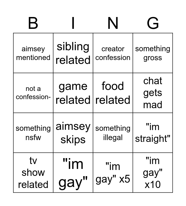This bingo card has 16 words: "im gay", "im straight", creator confession, aimsey mentioned, something nsfw, sibling related, something illegal, "im gay" x5, not a confession-, game related, tv show related, something gross, aimsey skips, chat gets mad, food related and "im gay" x10.