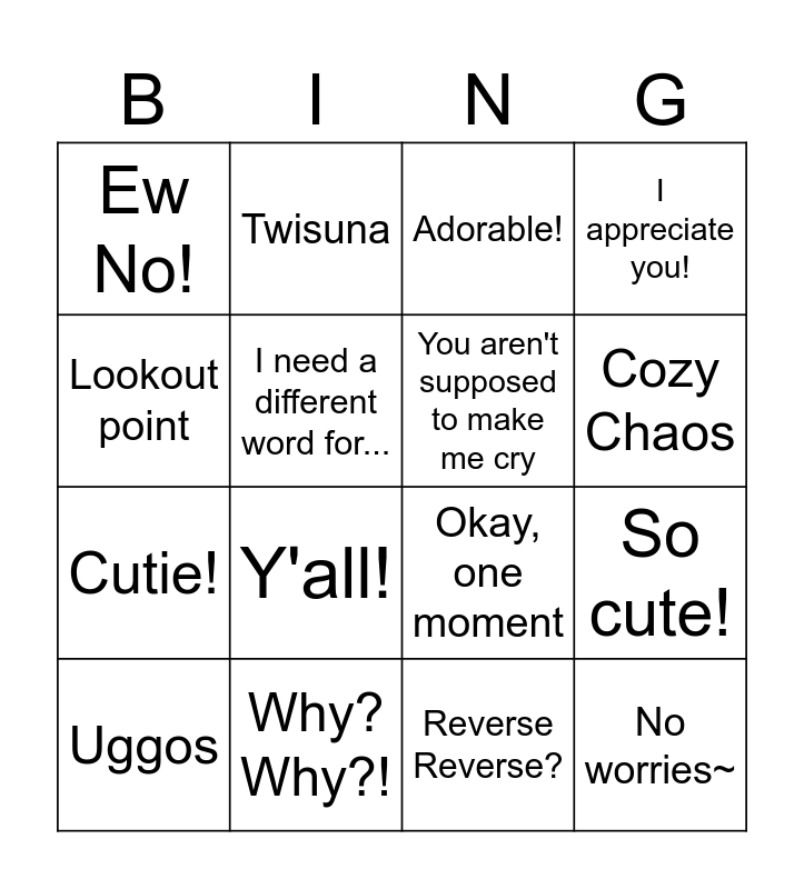 This bingo card has 16 words: Why? Why?!, So cute!, Adorable!, Ew No!, Cutie!, Twisuna, Okay, one moment, Reverse Reverse?, Lookout point, I need a different word for..., Uggos, I appreciate you!, Y'all!, Cozy Chaos, You aren't supposed to make me cry and No worries~.