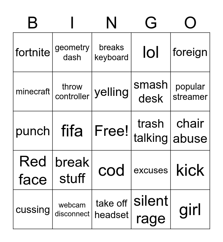 This bingo card has a free space and 24 words: break stuff, webcam disconnect, yelling, cussing, foreign, fortnite, minecraft, geometry dash, trash talking, cod, smash desk, punch, excuses, kick, throw controller, silent rage, chair abuse, breaks keyboard, popular streamer, fifa, girl, Red face, lol and take off headset.